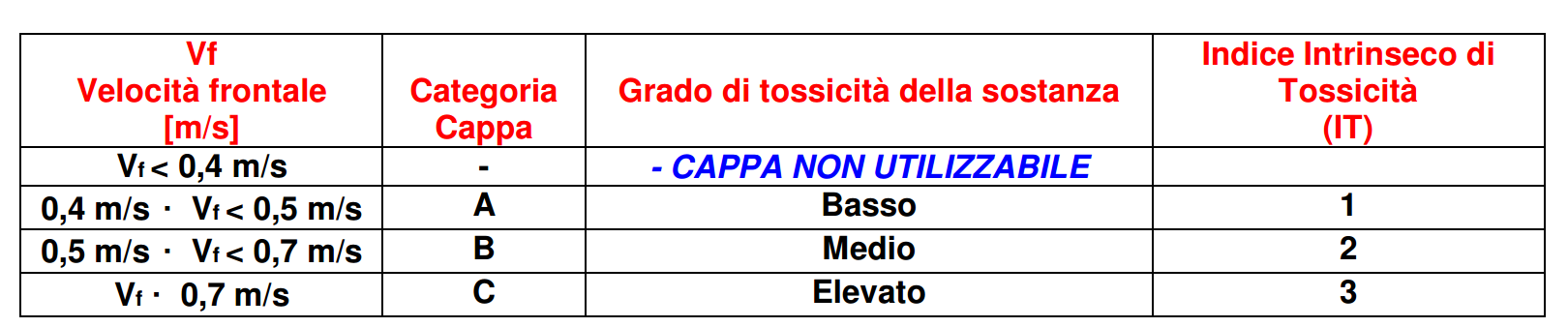 Questa invece una tabella riassuntiva con le categorie di una cappa chimica DUCTED interpretando le Unichim